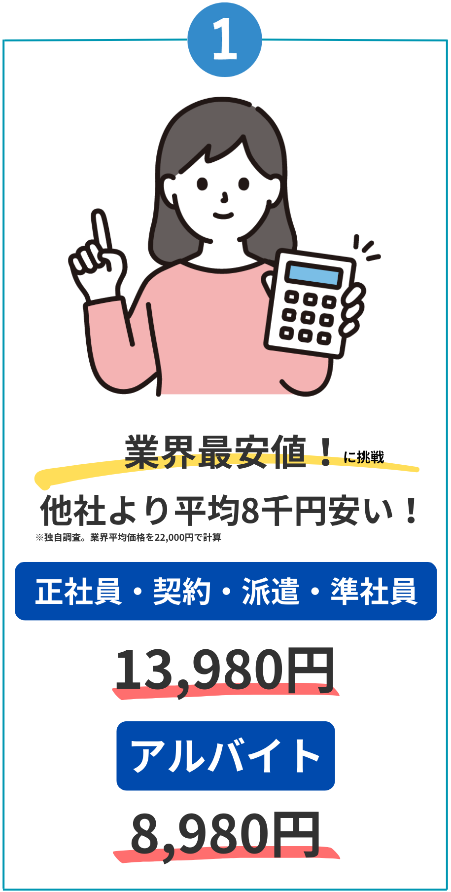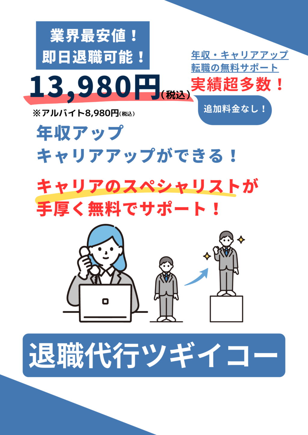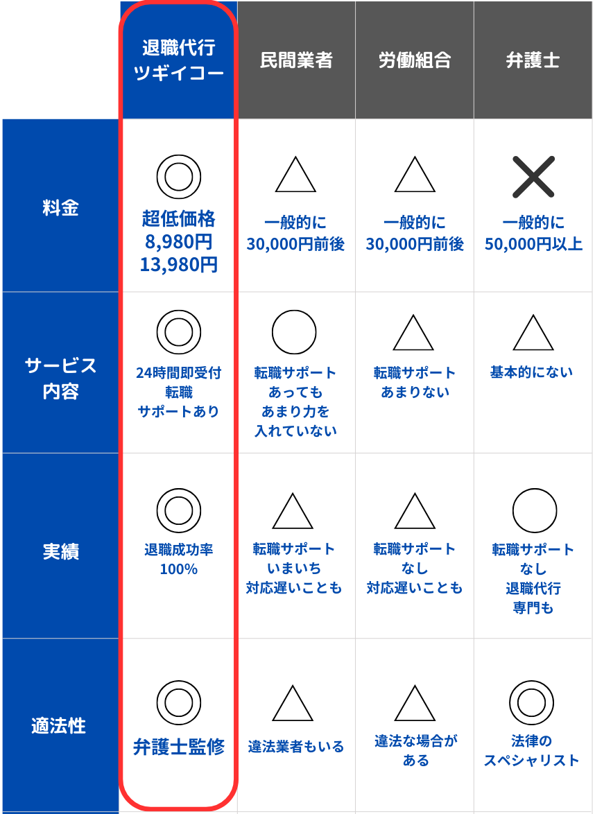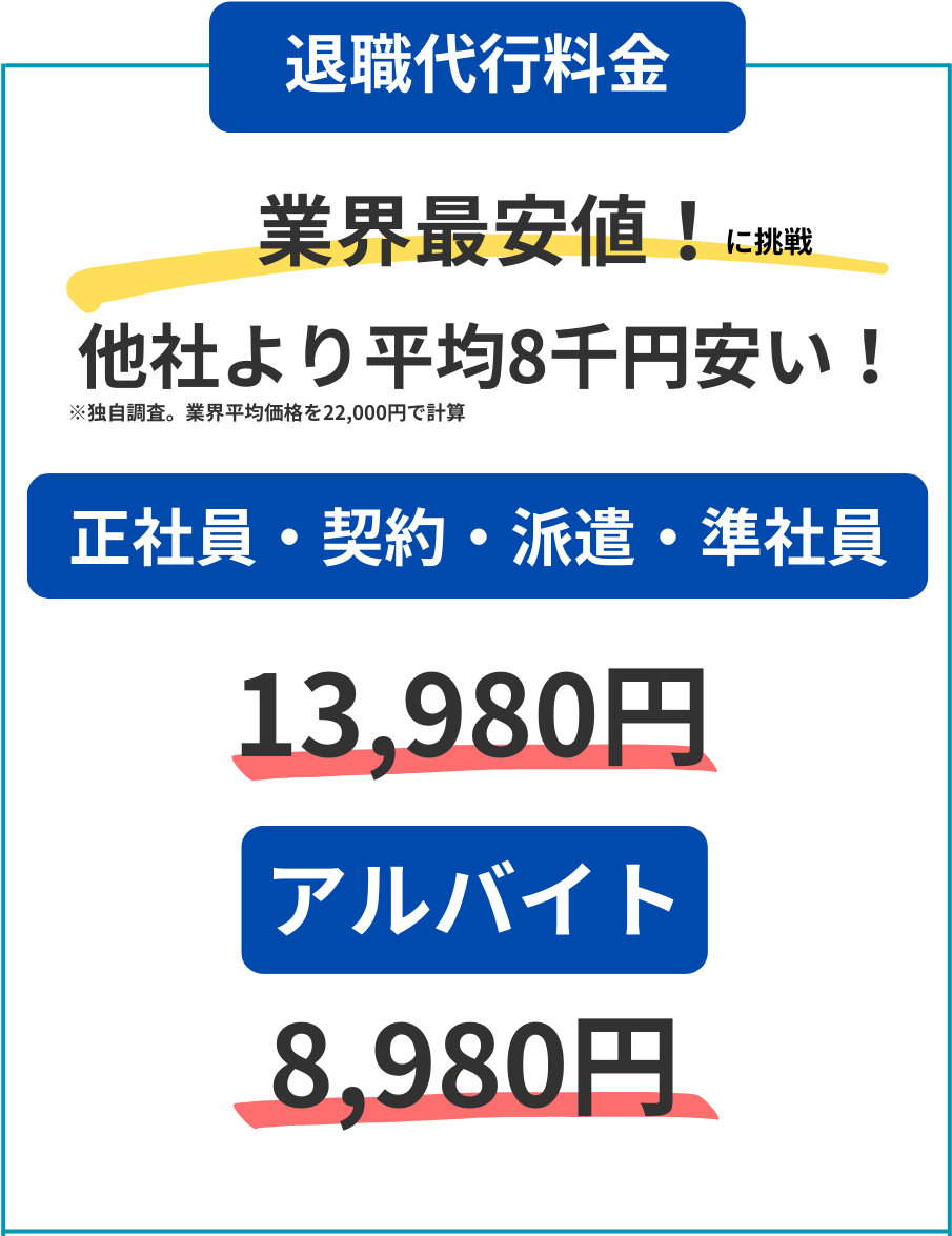単純に、利益をご依頼者様に還元しているためです。顧問弁護士もいますし、経費のかけ具合もサービスの内容も他社と同じですが、退職代行を受けるくらい辛い時に2万も3万もお金を取りたくない一心で値段を安くしています。皆さんに元気に次のキャリアに行ってほしいという思いでサービスを提供しております。